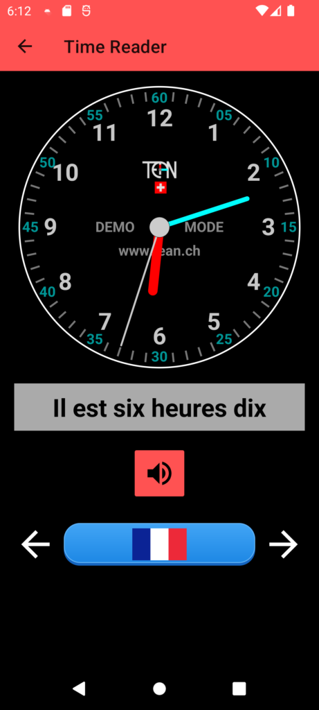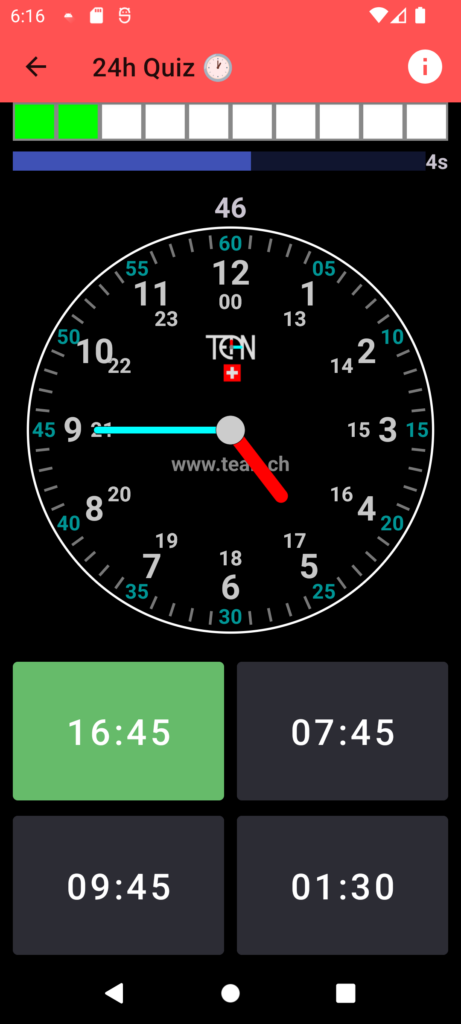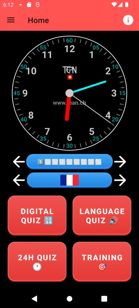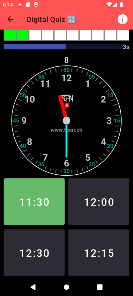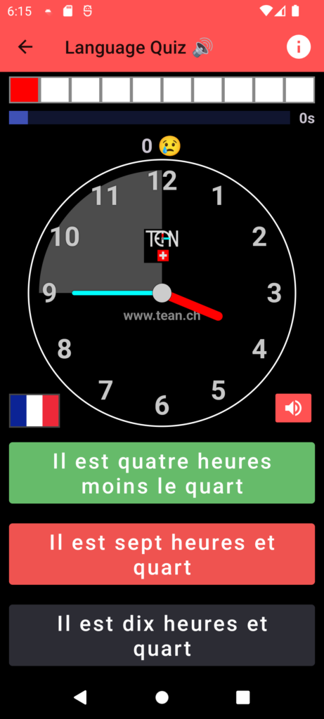 TEAN bietet mehrere Quiz mit progressivem Schwierigkeitsgrad an: um das Ablesen der Zeit anhand der Zeiger zu üben / um Begriffe wie „Viertel vor“, „fünf nach halb“, „zehn nach“ usw. zu verstehen und zu benutzen.