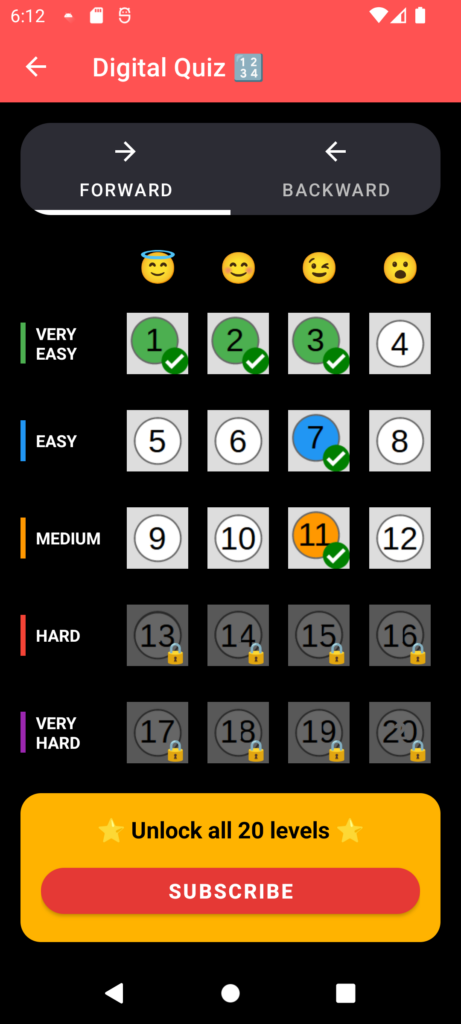 11 progressive Zifferblätter zur Auswahl, um die Zeit auf zunehmend vereinfachten Zifferblättern abzulesen; viele Sprachen verfügbar, um das Lesen des Zeitausdrucks in mehreren Sprachen zu üben, fast alle mit Sprachausgabe.
